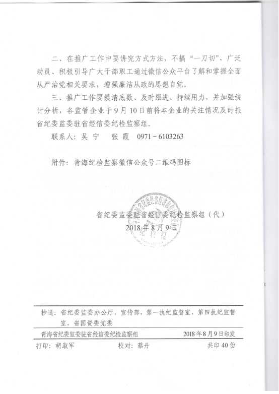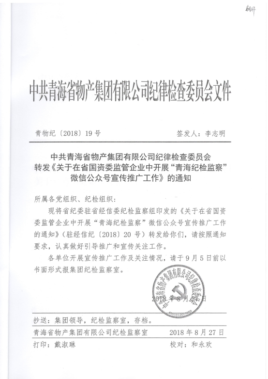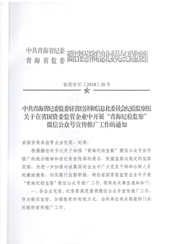 转发《关于在省国资委监管企业中开展“青海纪检监察”微信公众号宣传推广工作》的通知