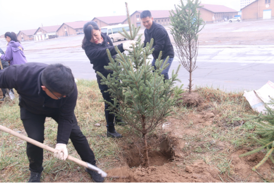 在园区内,大家兴致勃勃,干劲十足,有的挥锹挖坑、有的搬运树苗、有的扶苗培土、有的提水浇灌,经过3个小时的忙碌,100棵松柏昂然挺立,呈现出一派生机勃勃的景象。