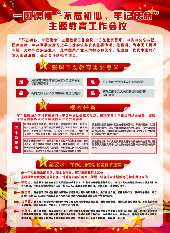 由集团党委副书记、总经理刘玲同志宣读《集团党委开展"不忘初心、牢记使命"主题教育实施方案》。集团党委书记、董事长王玉辉同志作了"不忘初心、牢记使命"主题教育动员讲话,对集团系统开展主题教育工作进行了安排部署,要求把主题教育与完成本单位转型升级、项目建设、生产经营等工作任务结合起来,切实把主题教育成果转化为企业发展的强大动力,推动青海物产高质量发展。省委"不忘初心、牢记使命"主题教育第十二巡回指导组组长任正德同志做了指导讲话。充分肯定了集团党委的前期工作,认为会议准备比较充分,有效统一了干部职工的思想,制定的主题教育《实施方案》操作性强,目标任务具体,动员讲话政治站位高,思想认识深,工作思路清晰。同时,结合工作组的职责就落实主题教育各项任务讲了六点意见。一是聚焦根本任务;二是把握"十二"字总要求;三是紧扣"五句话"总目标;四是落实"四个贯穿";五是抓实"六项重点"举措;六是力戒形式主义,严禁主题教育走形式、走过场。