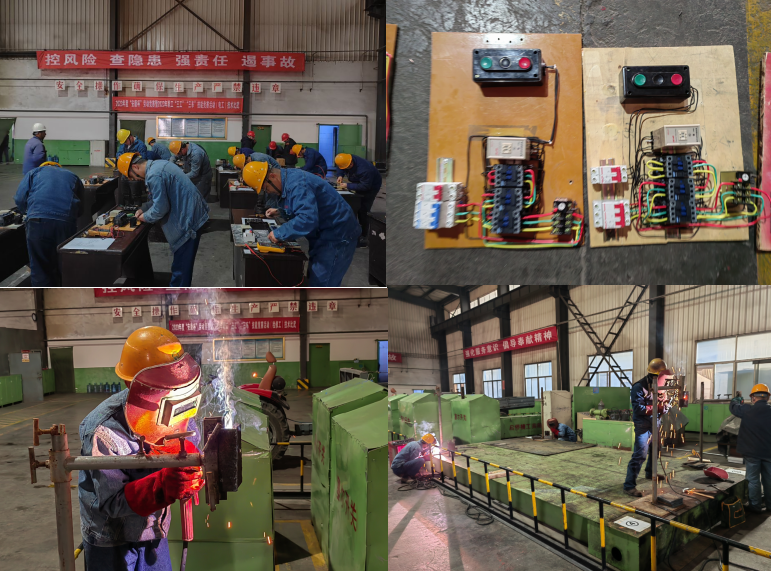 电工竞赛现场,参赛选手面对繁琐的配盘指导图从容应对。剪线、剥线、压接……,一招一式都是那么的娴熟轻快,肃静的环节里冲刺着“浓浓的火药味”;而维修工比赛现场内却异常热闹,新老电工、钳工围绕在设定的操作台前,紧锣密鼓地剪裁组料、焊接配件、清理焊渣、打磨表面,一套动作行云流水、一气呵成。