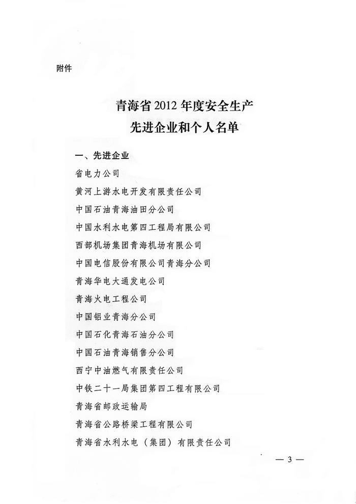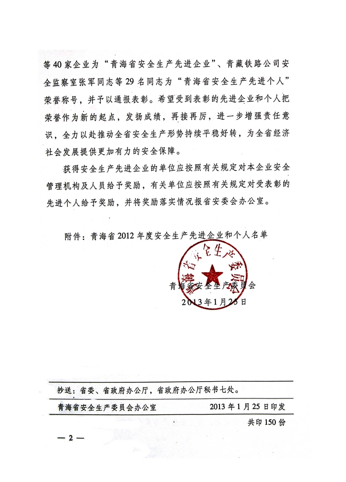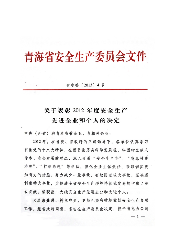 2012年,在省委、省政府的正确领导下,青海省物产集团总公司认真学习贯彻党的十八大精神,全面贯彻落实科学发展观,牢固树立以人为本、安全发展的理念,深入开展"安全生产年"、"隐患排查治理"、"打非治违"等活动,为促进全省安全生产形势持续稳定好转做出了积极贡献。为此,经省政府同意,省安全生产委员会决定授予青海省物产集团总公司"2012年度安全生产先进企业"荣誉称号。