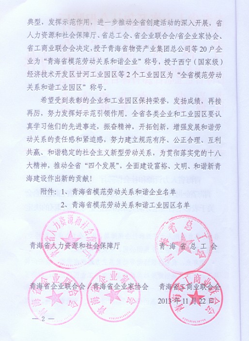 青海省物产集团总公司荣获“青海省模范劳动关系和谐企业”称号